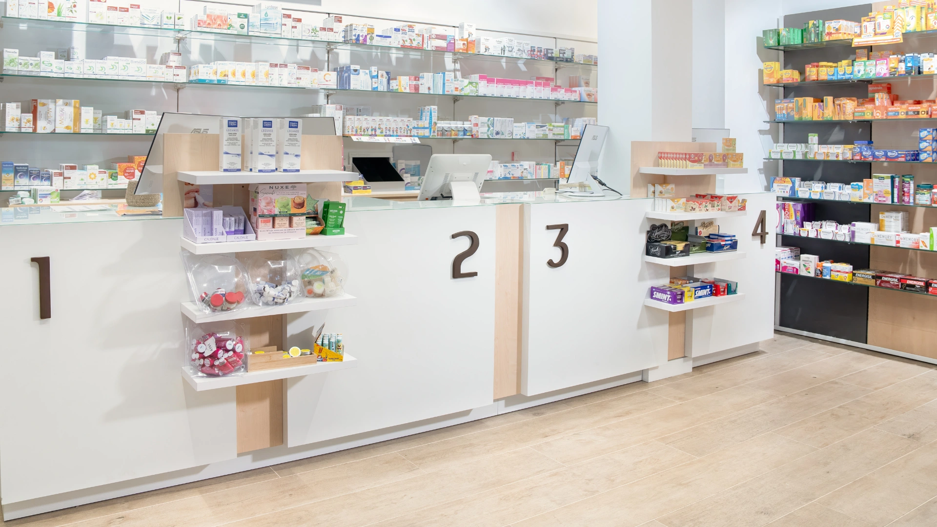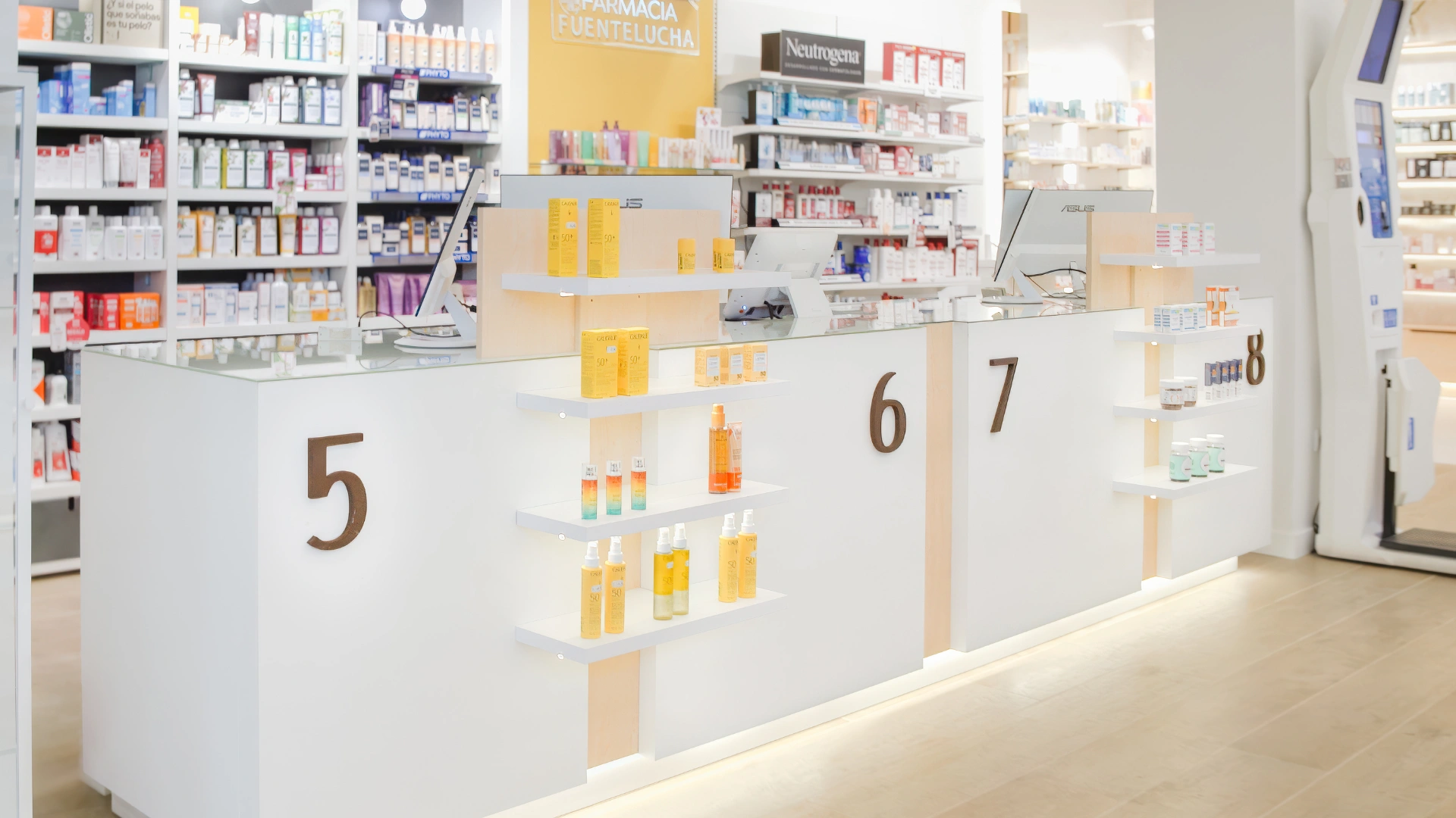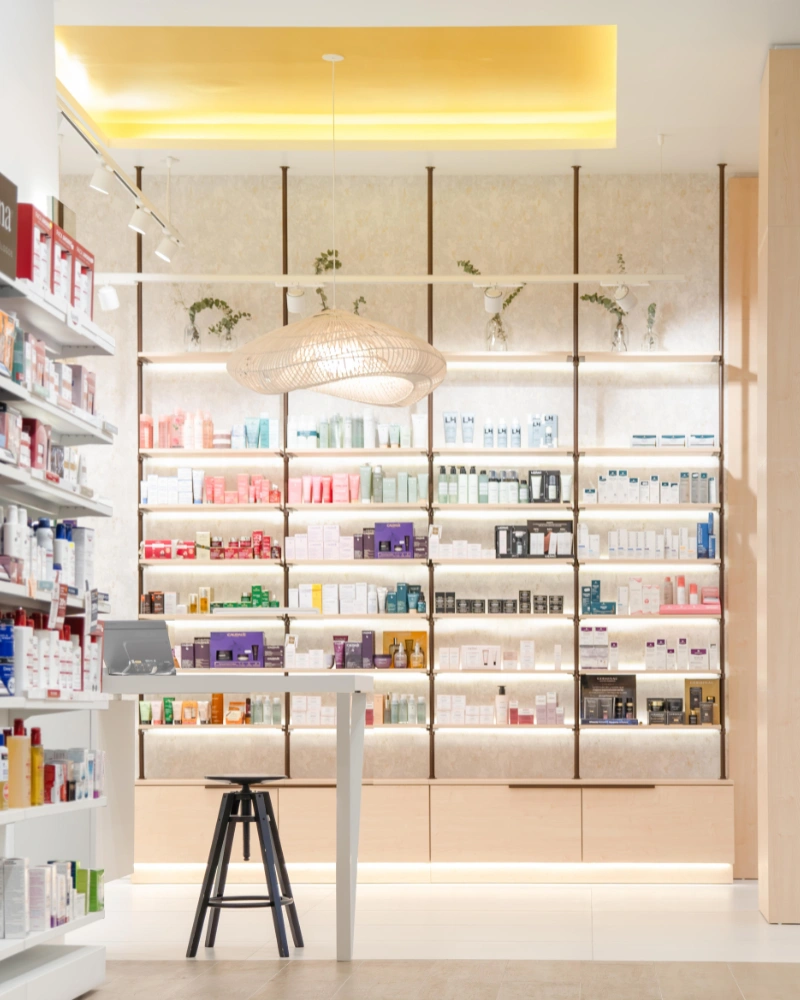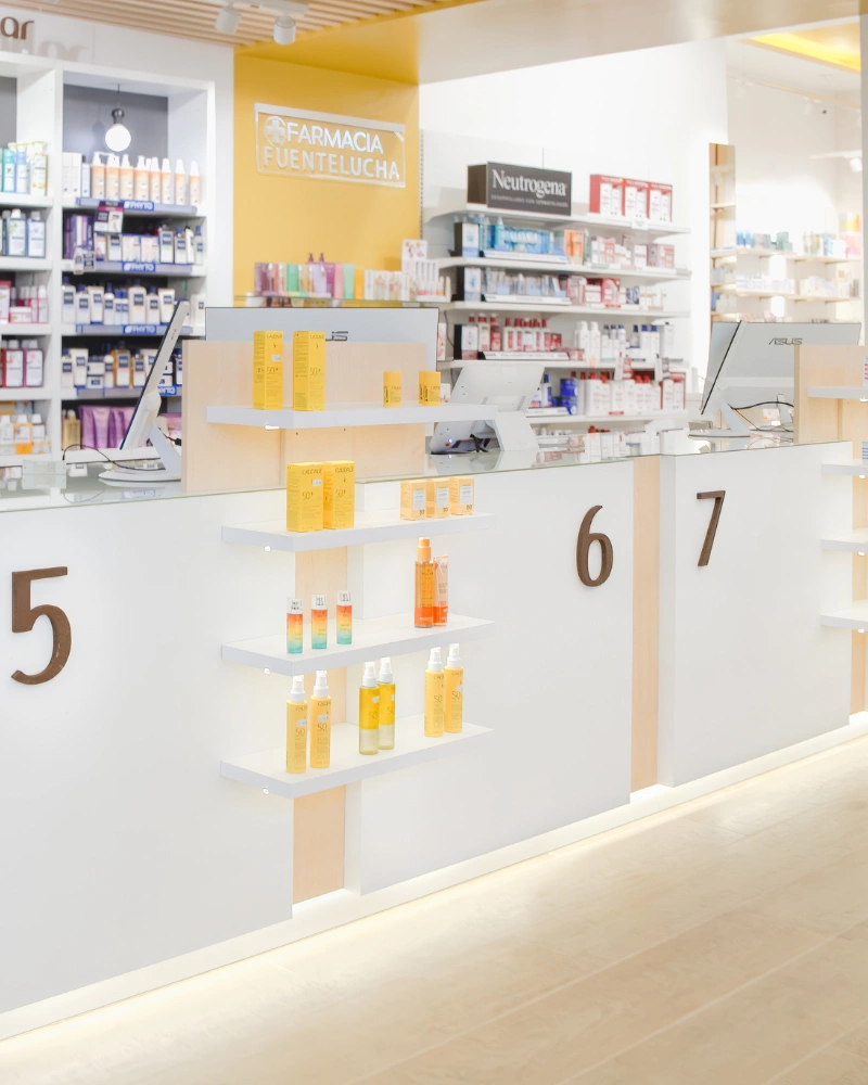 La reforma de la Farmacia Fuentelucha ha transformado el espacio en un ambiente moderno, acogedor y altamente funcional. Con un enfoque en la iluminación cálida en tonos amarillos, hemos creado una atmósfera relajante y atractiva. El punto de venta ha sido optimizado para una experiencia de compra eficiente, mientras que la exposición de productos se ha reorganizado para maximizar la visibilidad y el atractivo de los artículos.