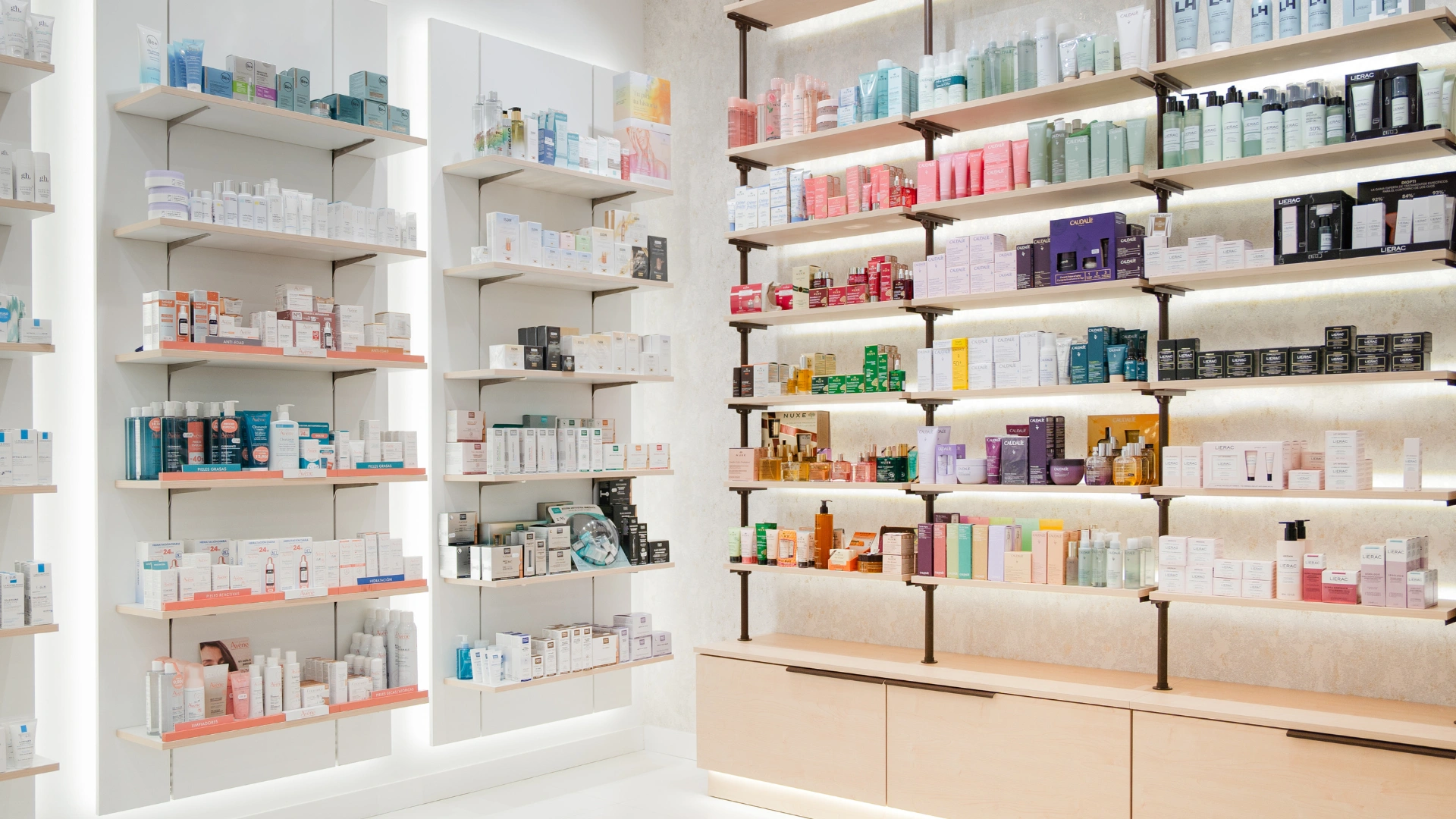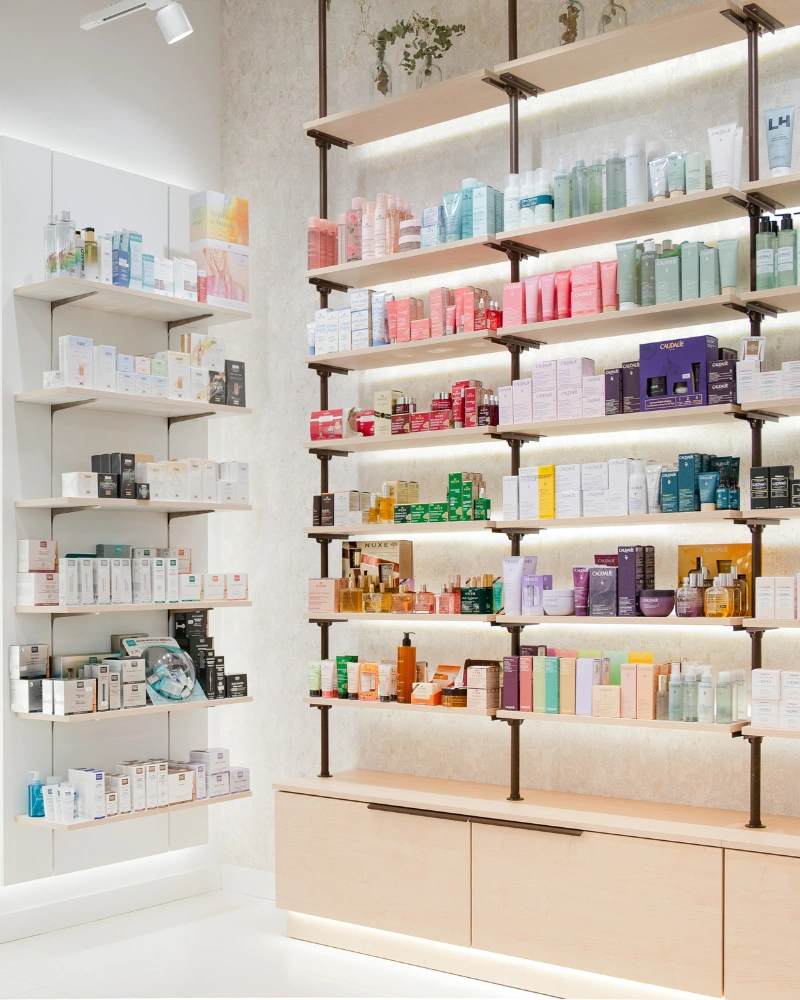 El beauty corner se ha diseñado para ofrecer una exhibición ordenada y atractiva de productos de belleza. Los estantes y displays se han colocado estratégicamente para facilitar el acceso y la visualización de los productos, permitiendo a los clientes encontrar fácilmente lo que buscan. La disposición cuidadosa y la iluminación enfocada aseguran que cada artículo esté bien destacado, creando un espacio acogedor y elegante para la belleza y el cuidado personal.