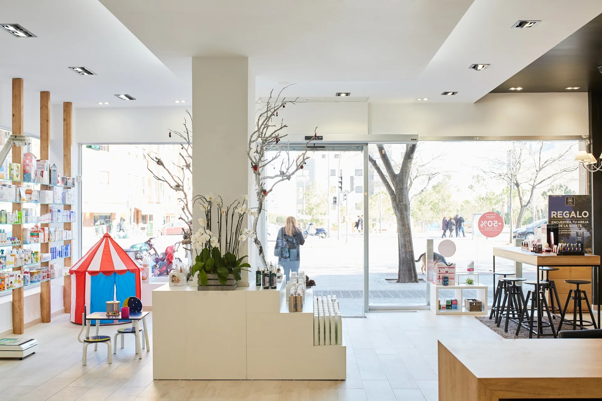 La sección de dermocosmética se distingue por su diseño y acabados diferenciados, creando un ambiente exclusivo. Los escaparates no solo exhiben productos, sino que también ofrecen una visión clara y abierta de la farmacia desde la calle.