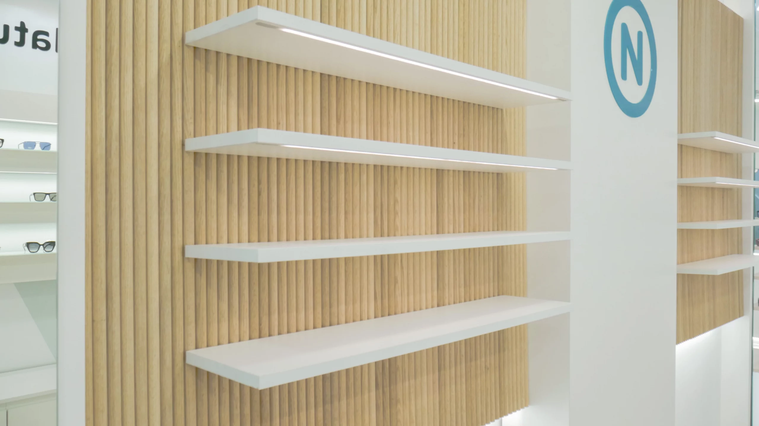 Nuestros expositores Tótem y Tótem Blank desempeñan un papel clave tanto en el diseño como en la exposición de producto. Con estanterías curvas iluminadas y baldas flotantes, aportan ligereza, ritmo y dinamismo visual al espacio. Cada montura se presenta como una pieza única, cuidadosamente iluminada para resaltar su diseño y tecnología. La exposición fluye con naturalidad, guiando al cliente a través de una experiencia visual envolvente.