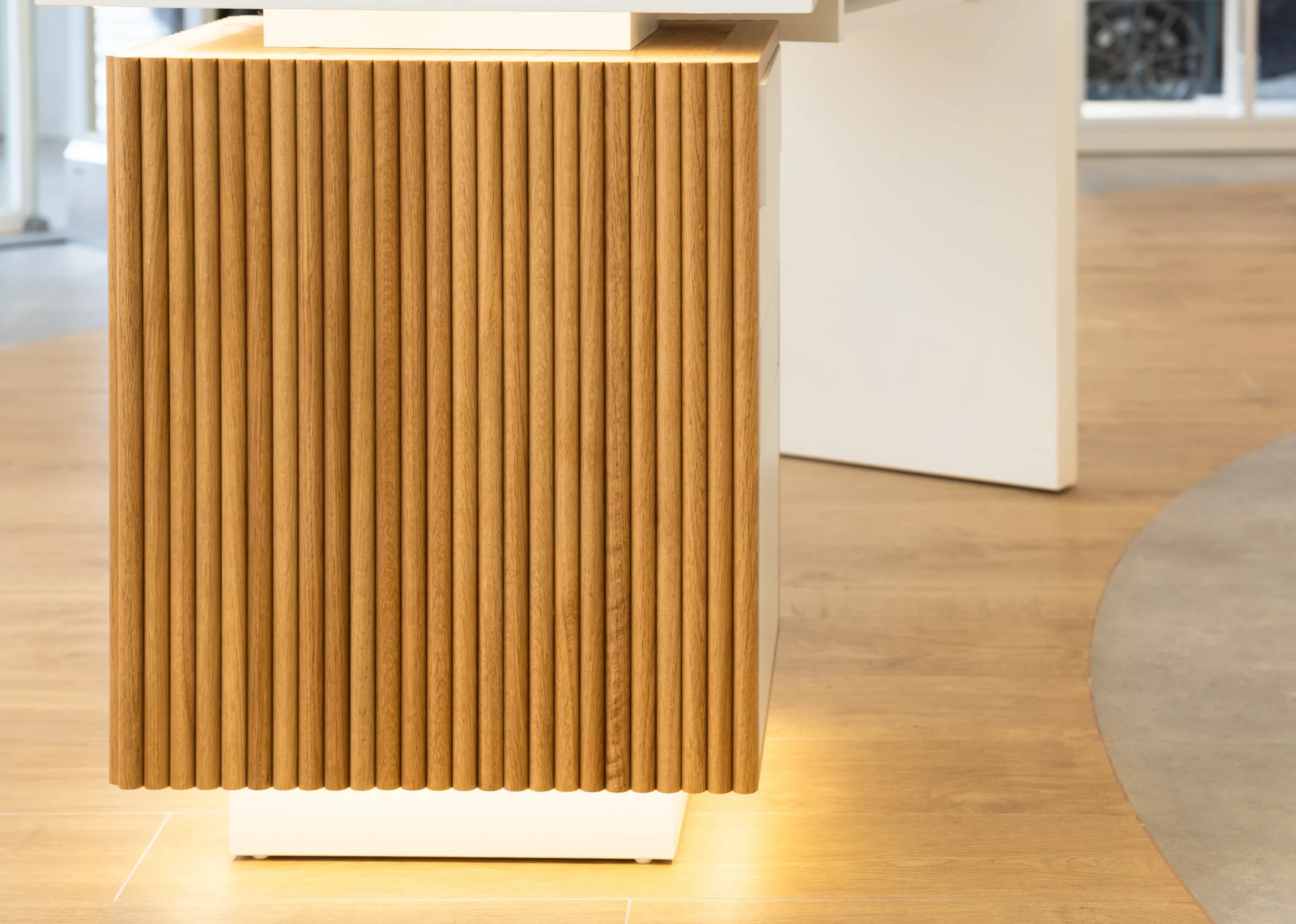 Hemos trabajado con una combinación de materiales que aportan calidez, sofisticación y ligereza visual. La madera de roble crea un equilibrio perfecto entre modernidad y confort.