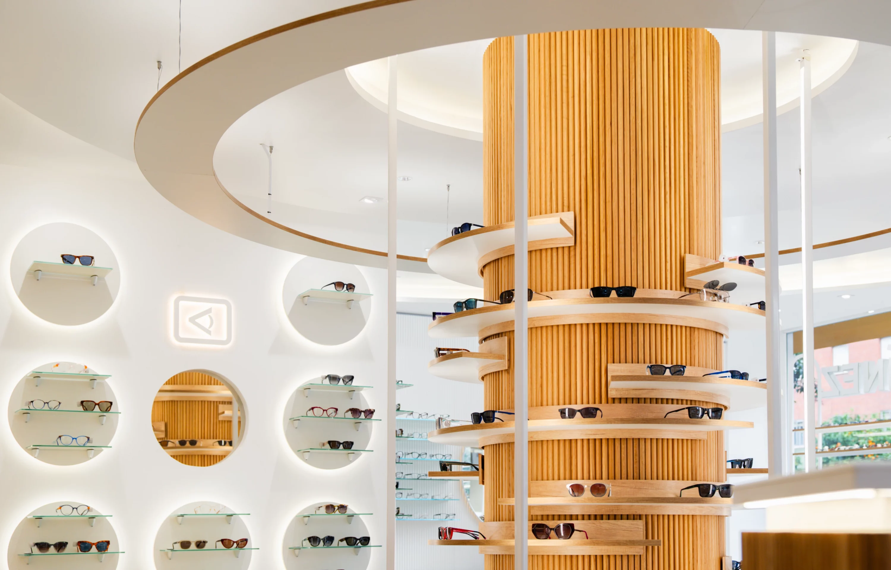 El eje central del proyecto es un pilar protagonista, diseñado para guiar la mirada y estructurar la exposición. La distribución fluida optimiza la circulación del cliente, permitiendo una experiencia intuitiva y atractiva dentro de la óptica.