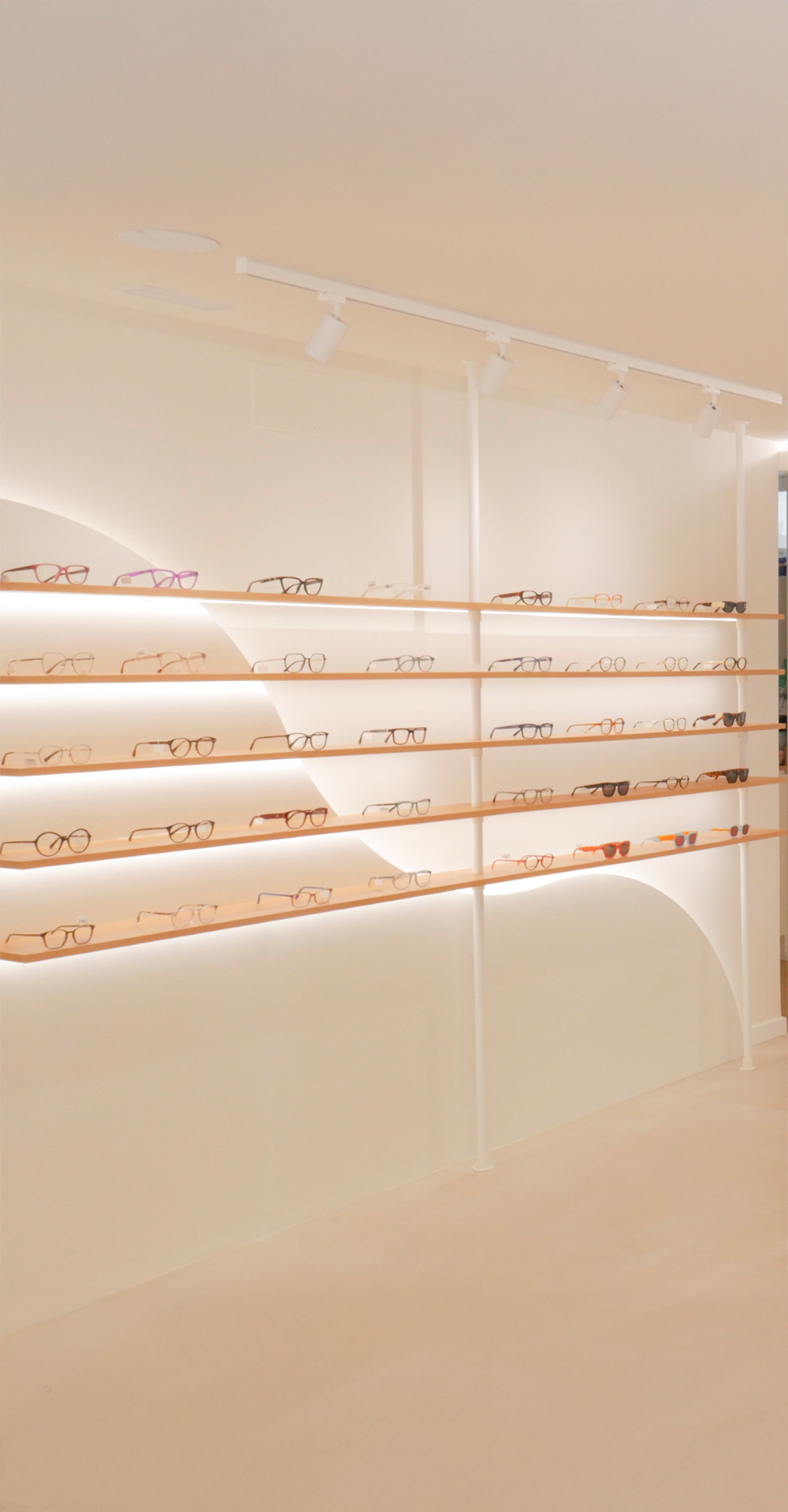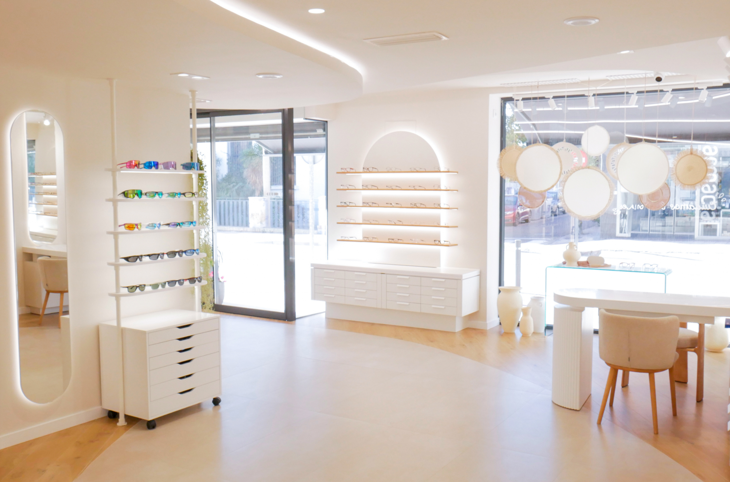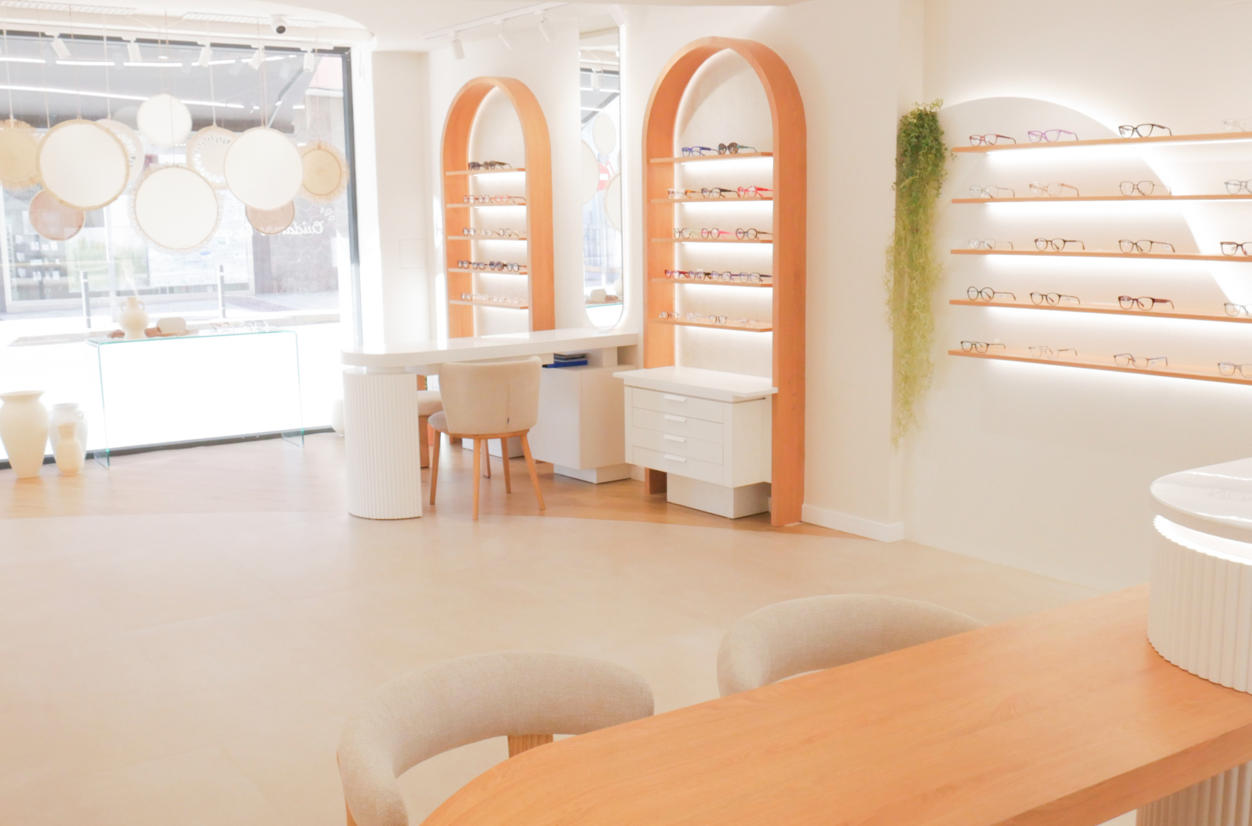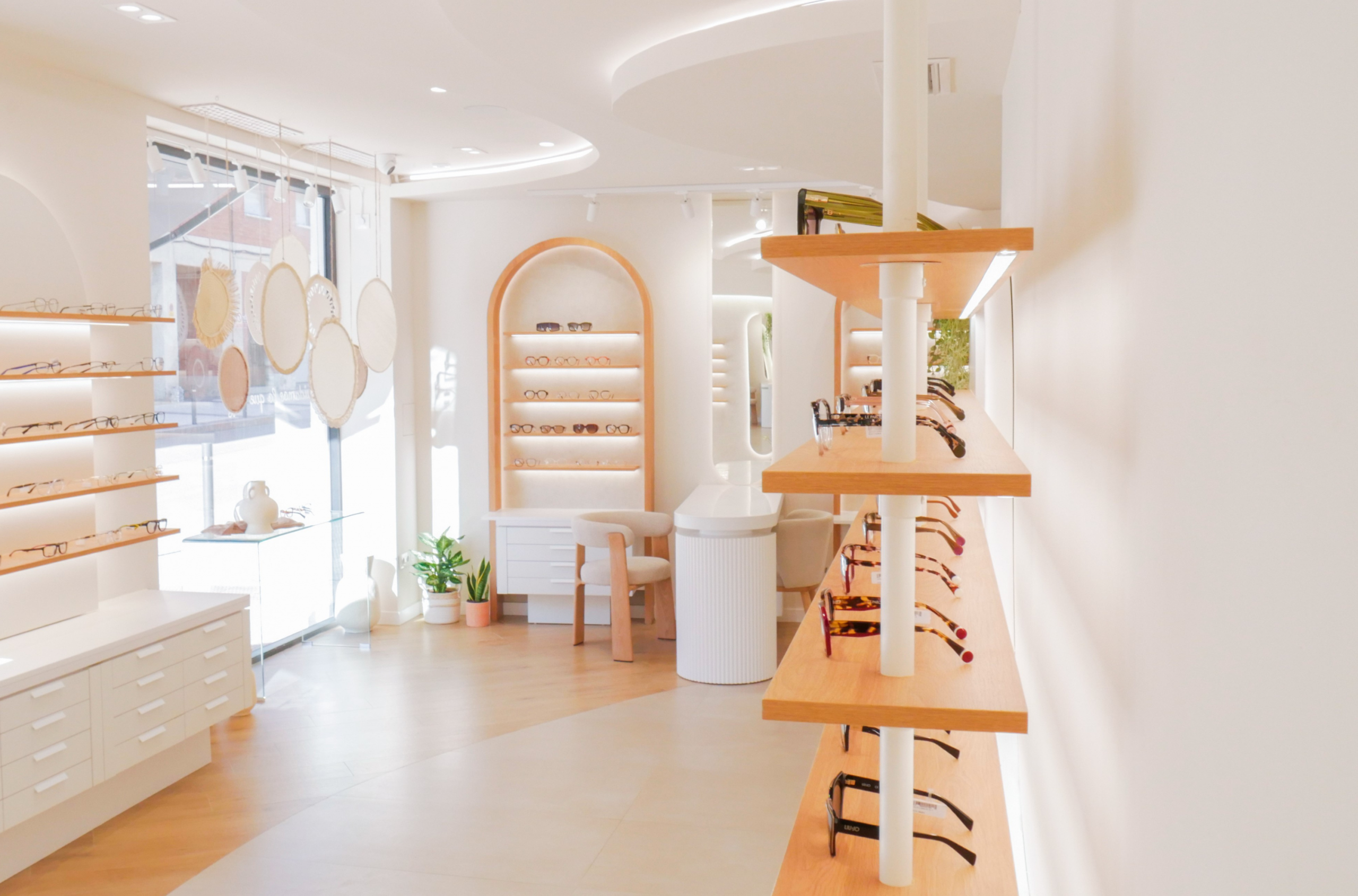 Los expositores se integran en el diseño general como parte de la arquitectura del espacio. Con líneas suaves y una composición que combina funcionalidad y estética, las gafas se presentan de manera ordenada y accesible, destacando por contraste y luminosidad. Las superficies claras y los materiales nobles aportan equilibrio visual, invitando a descubrir cada montura con una sensación de ligereza y coherencia.