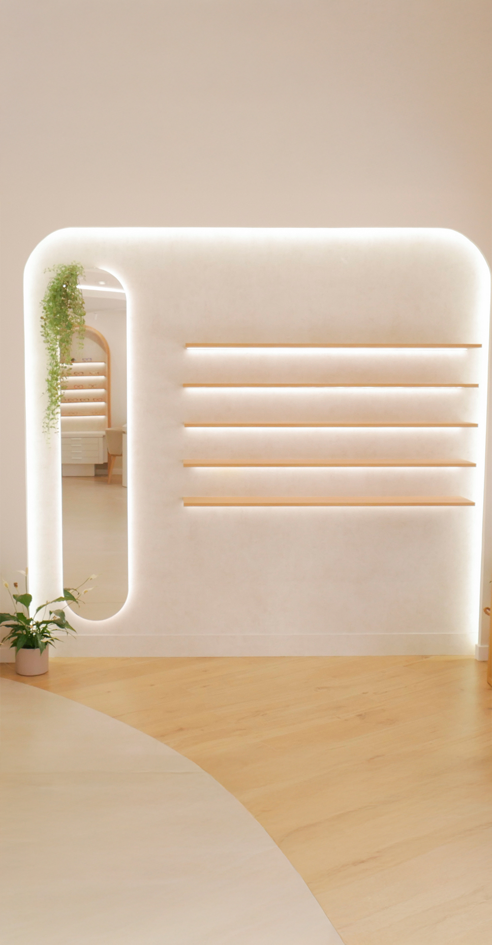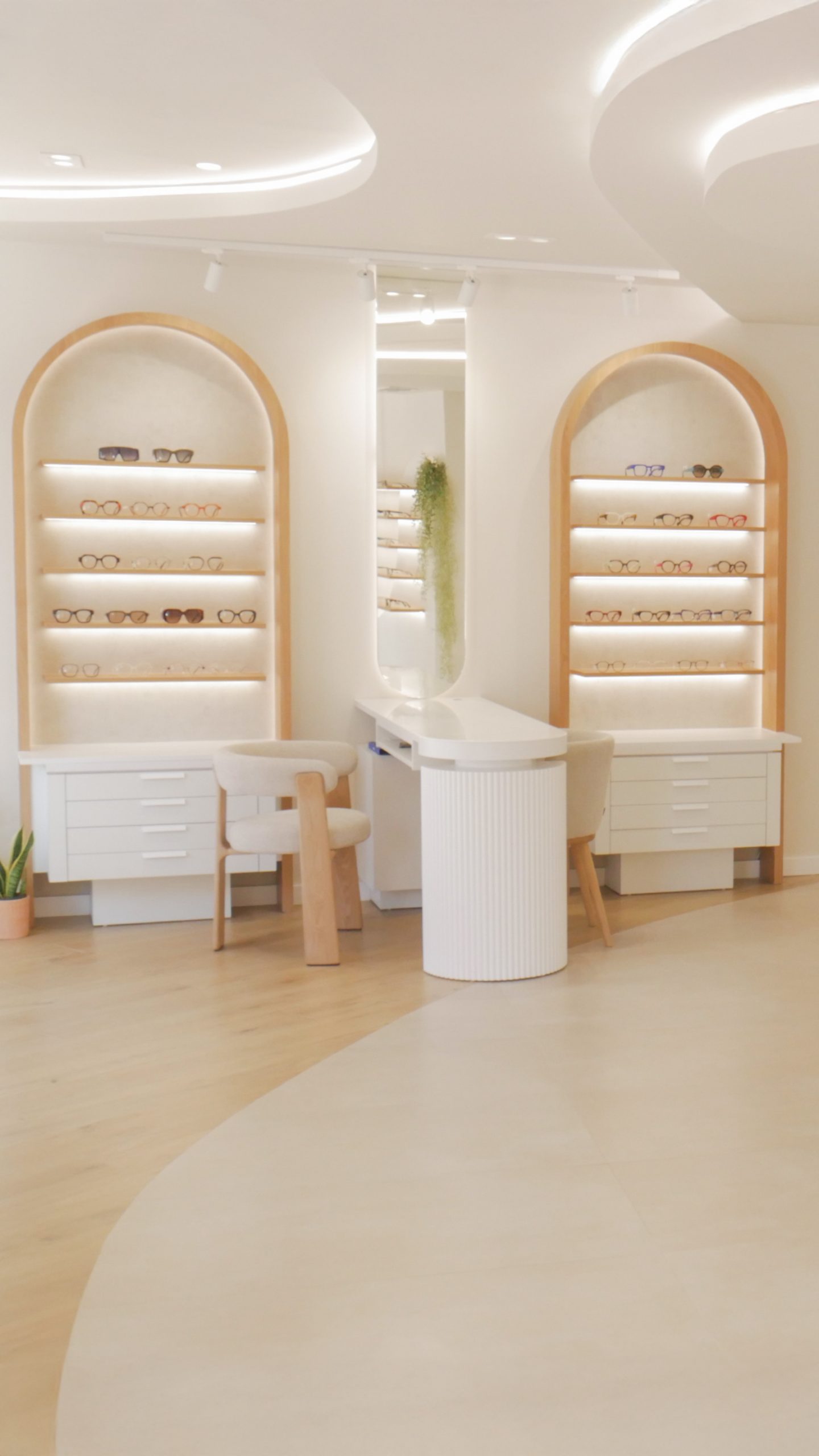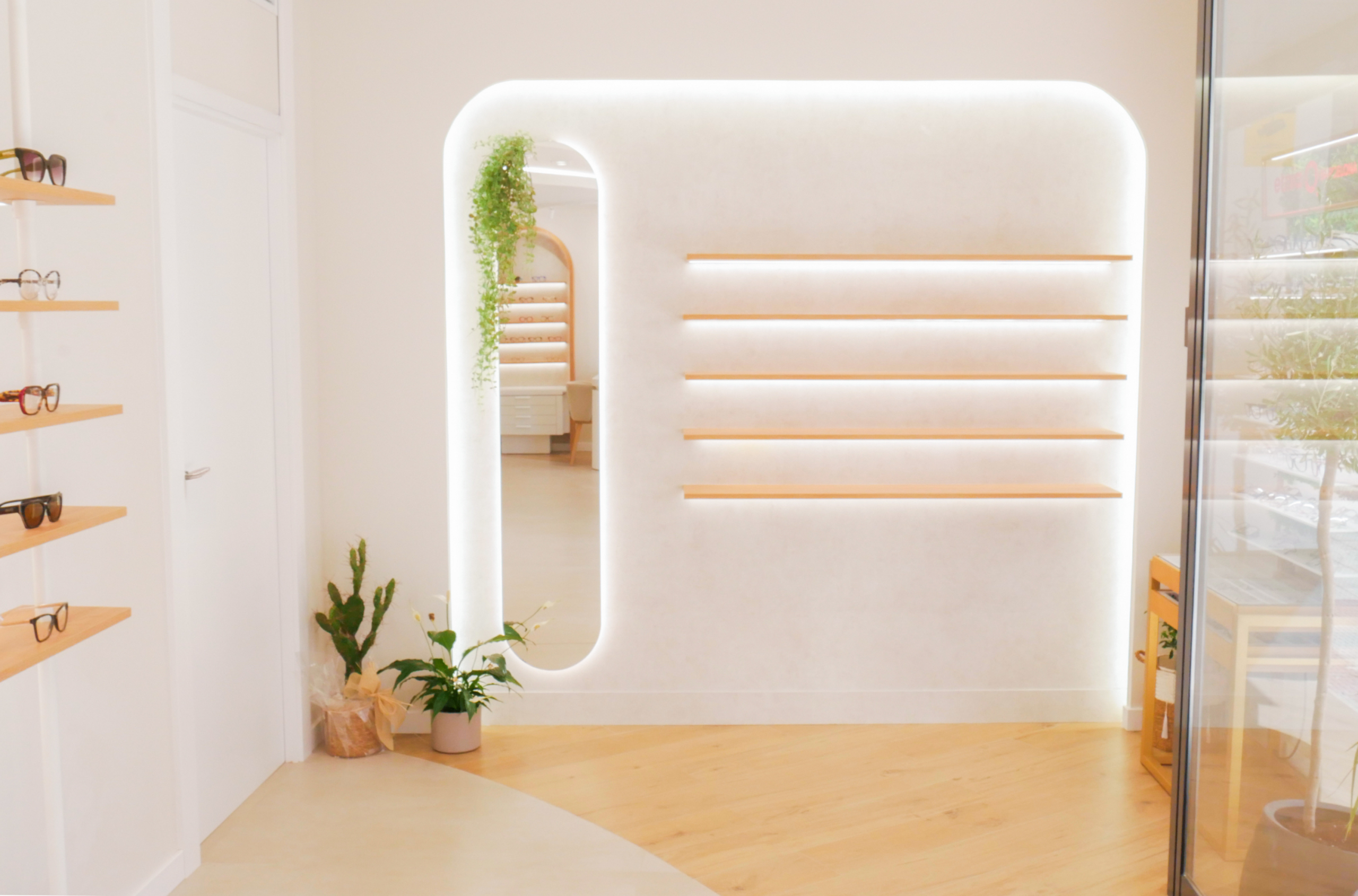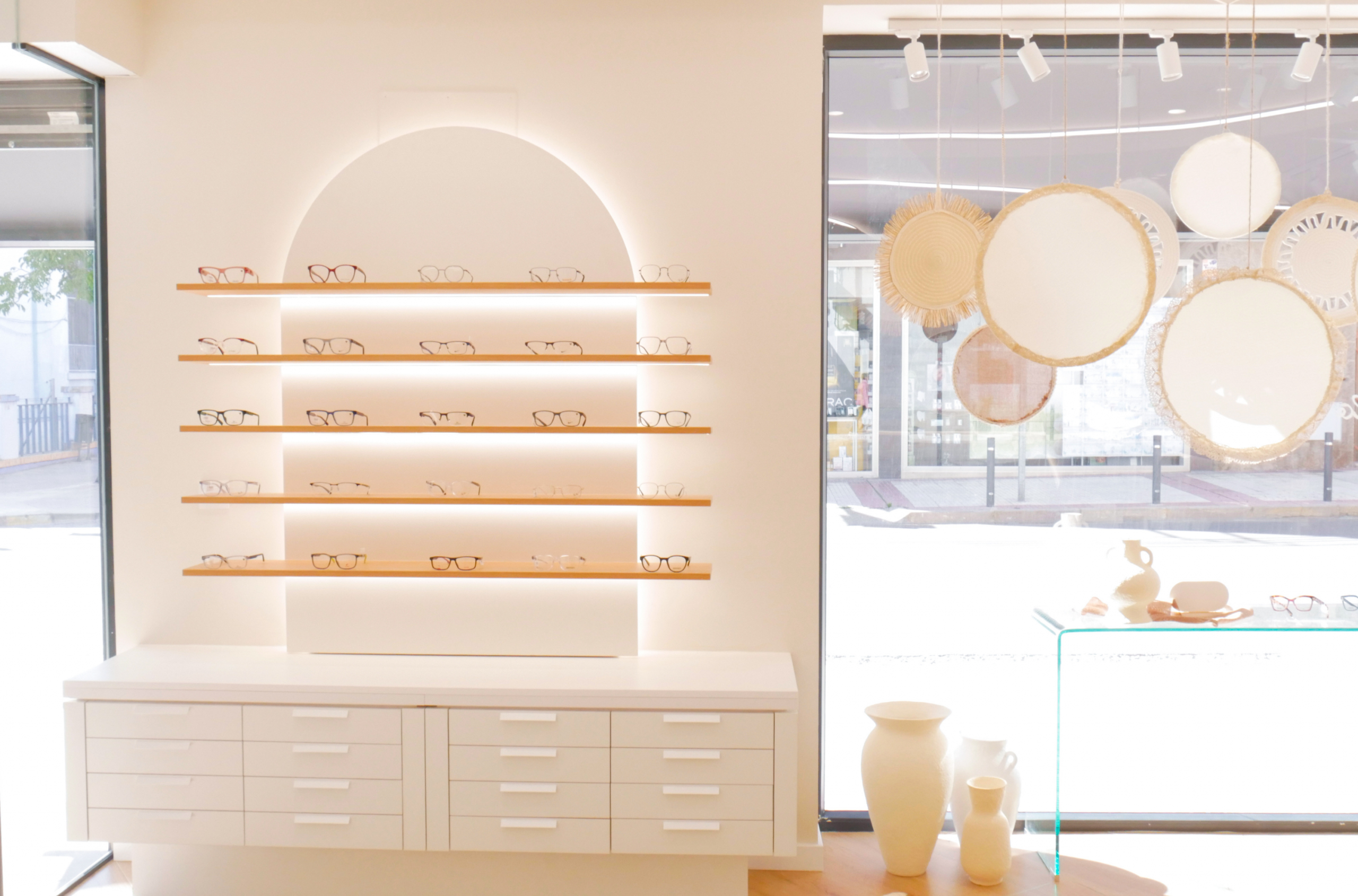 Los expositores se integran en el diseño general como parte de la arquitectura del espacio. Con líneas suaves y una composición que combina funcionalidad y estética, las gafas se presentan de manera ordenada y accesible, destacando por contraste y luminosidad. Las superficies claras y los materiales nobles aportan equilibrio visual, invitando a descubrir cada montura con una sensación de ligereza y coherencia.