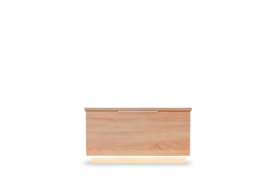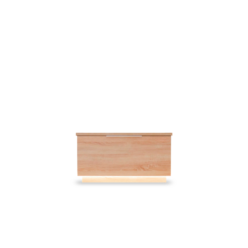 Cajonera realizada en melamina acabado roble Vicenza claro. Incorpora un cajón de gran capacidad con guía Hettich de extracción total con freno, tirador metálico blanco mate e iluminación LED inferior.