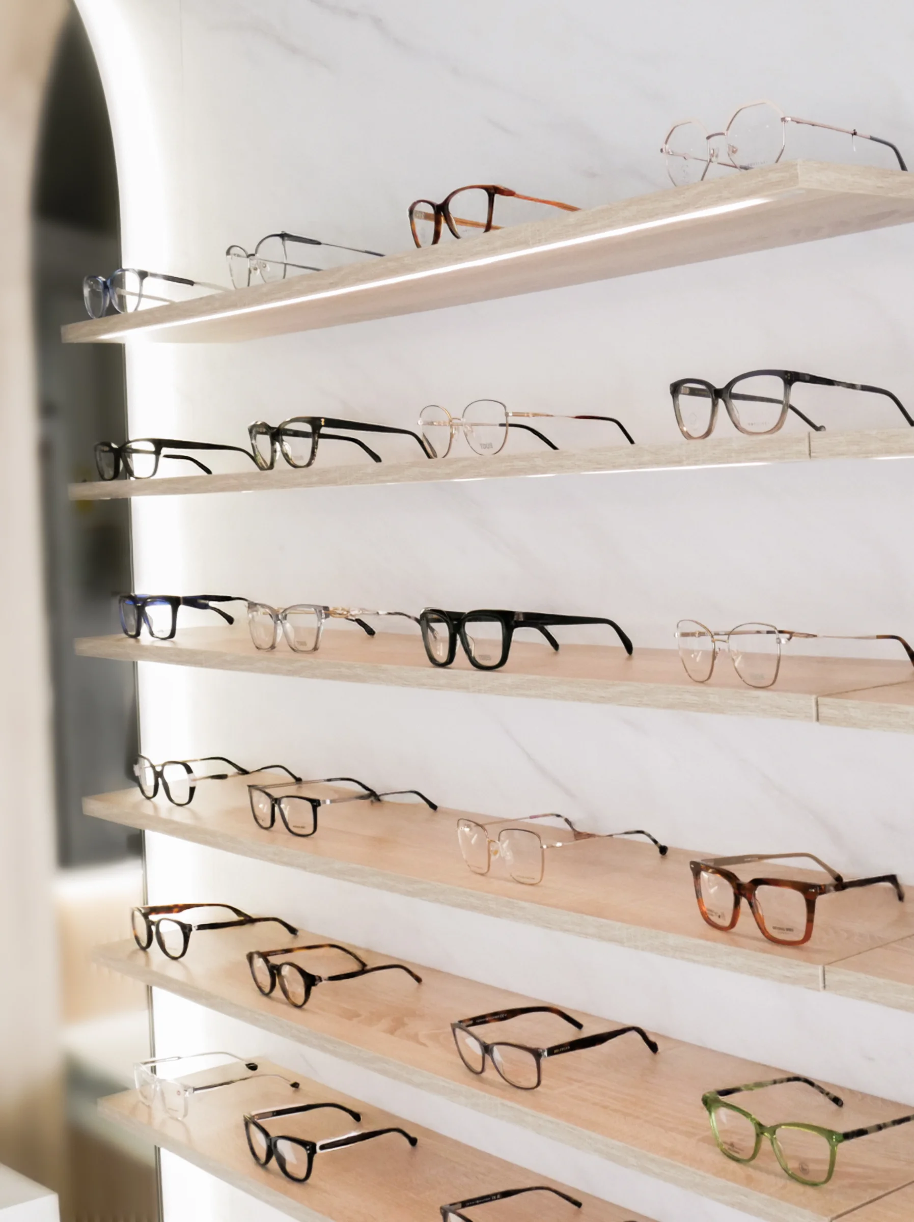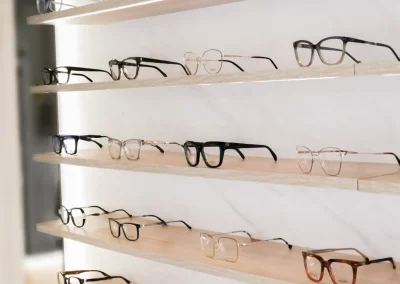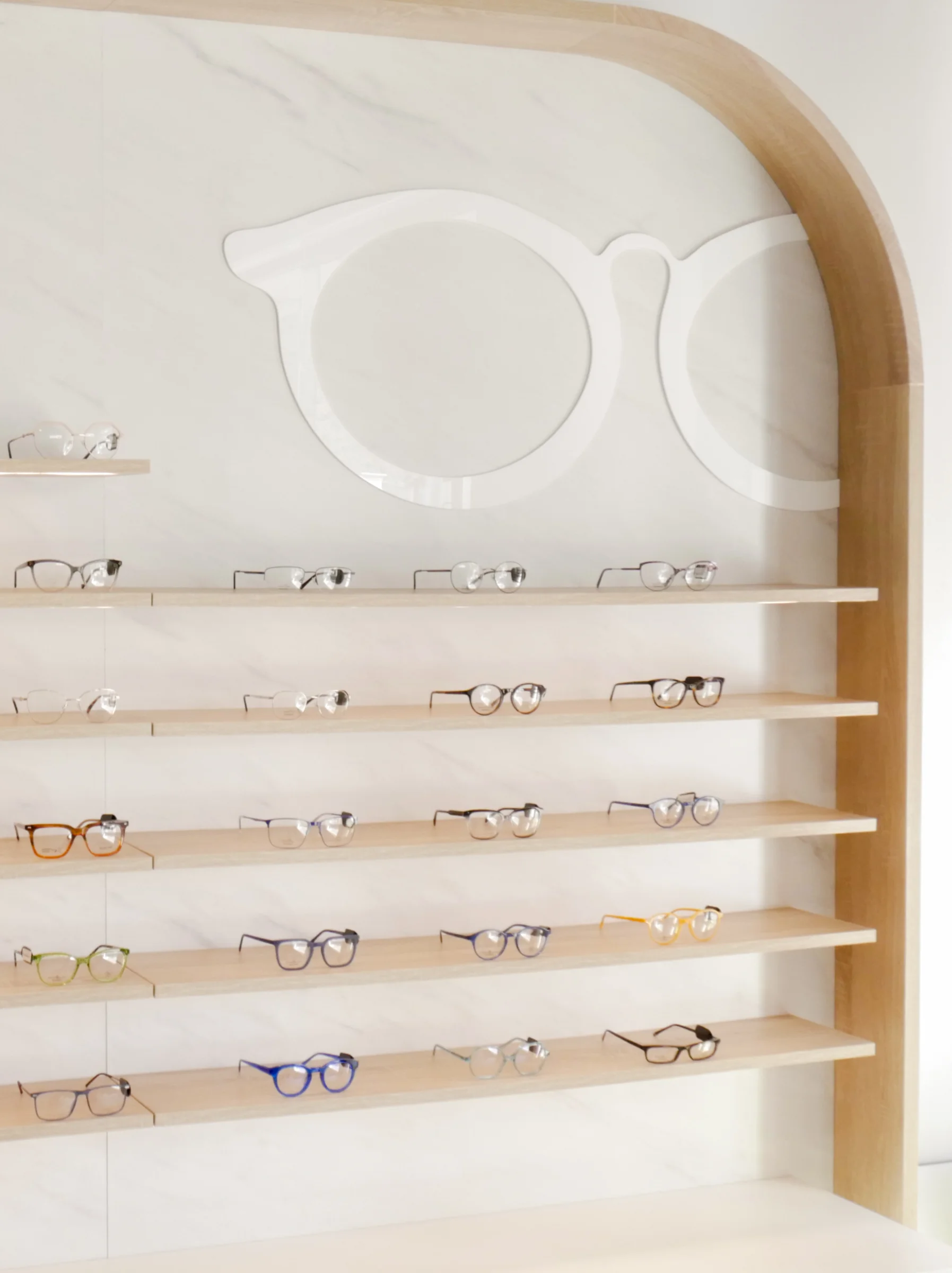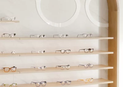 Mueble de exposición con iluminación integrada y almacenamiento inferior, diseñado para organizar y destacar productos y gafas.