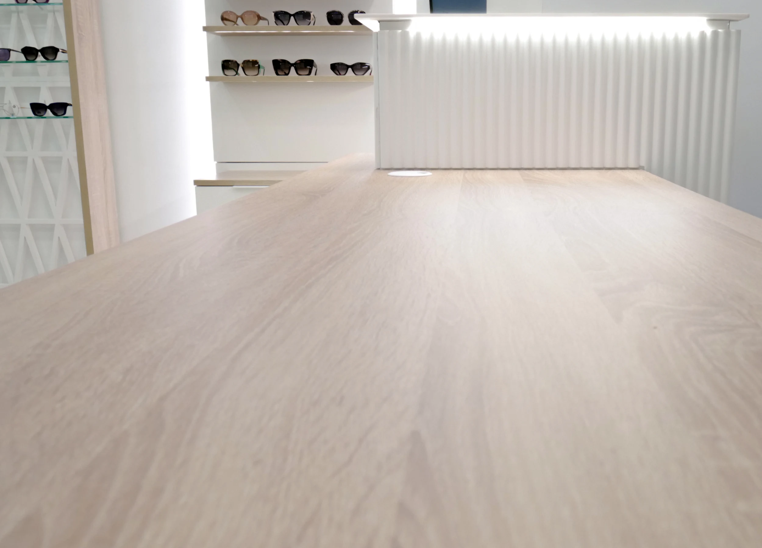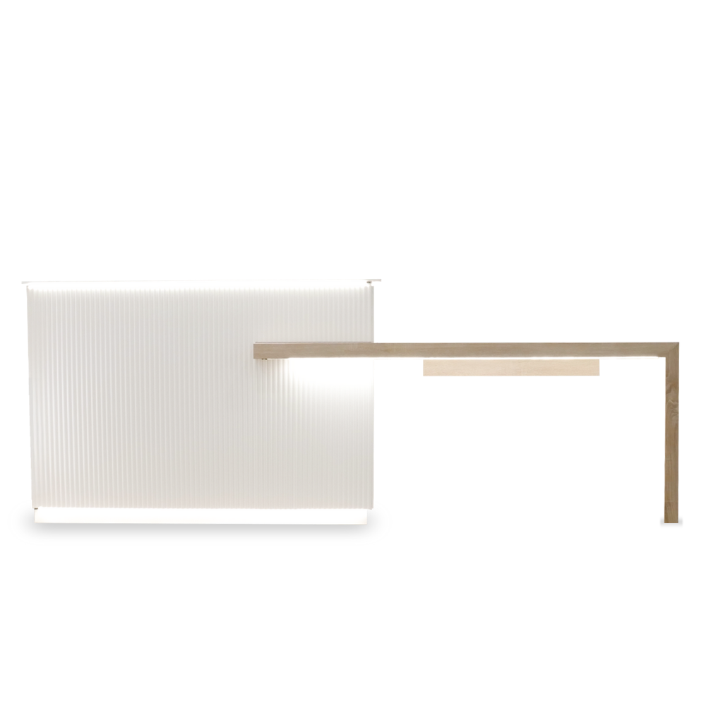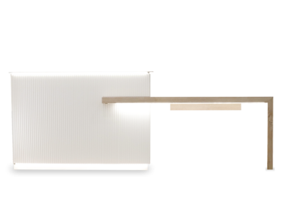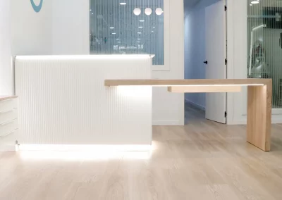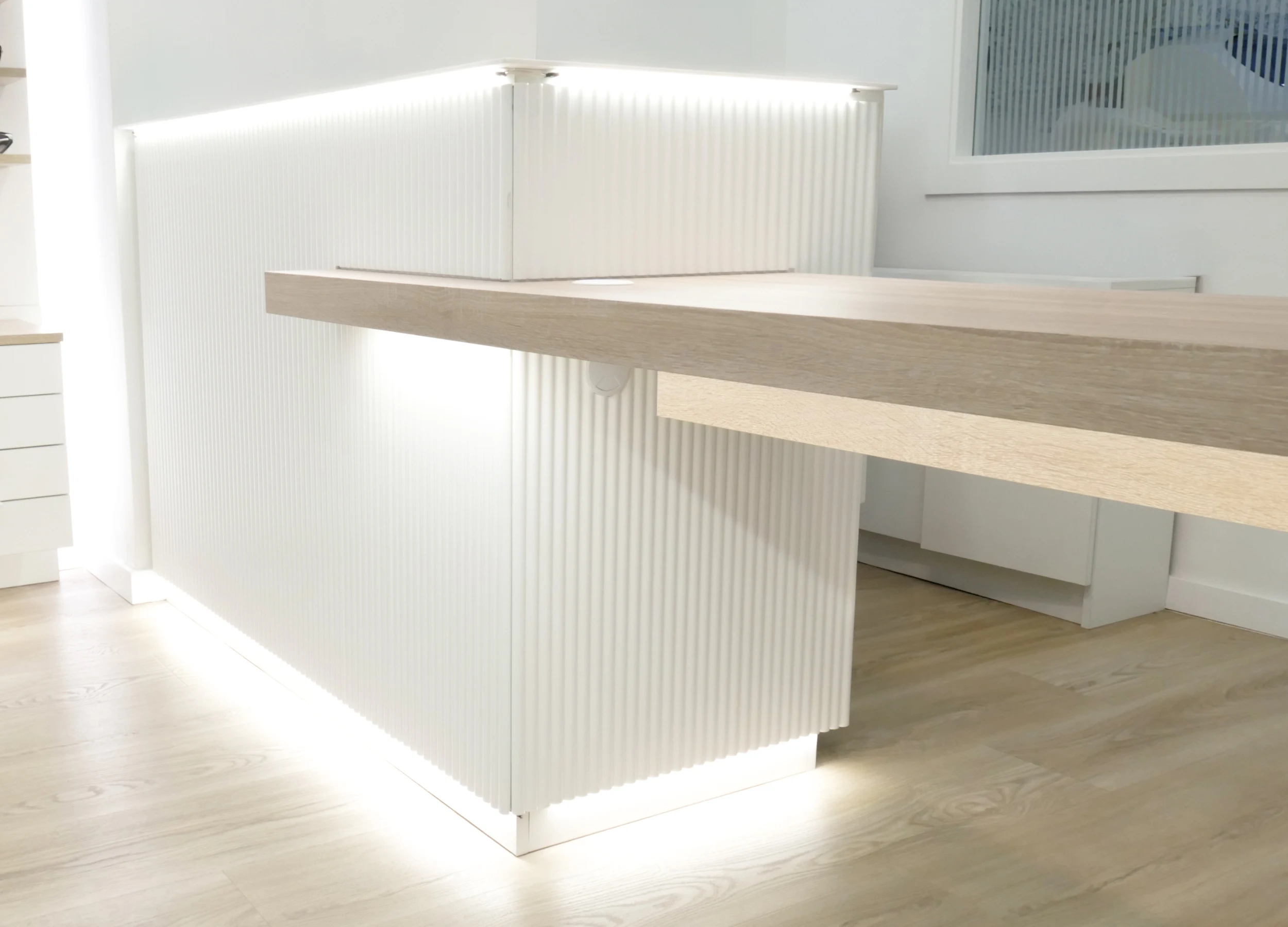 Mostrador con LED y encimera en solid surface, con cajones, bandejas, baldas y mesa auxiliar integrada. Ideal para quienes buscan un conjunto completo que combine mostrador y zona de atención al cliente.